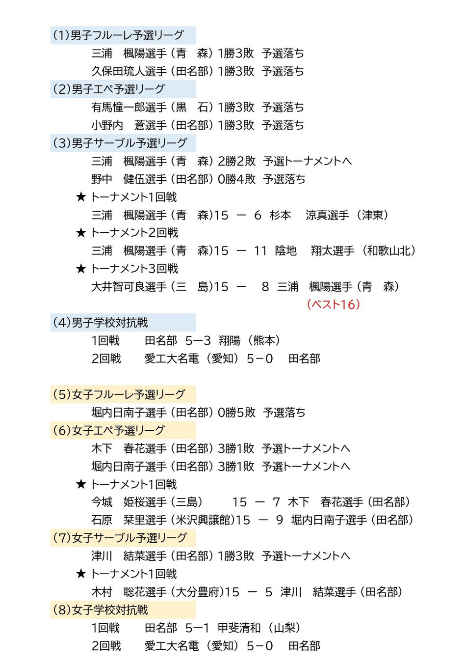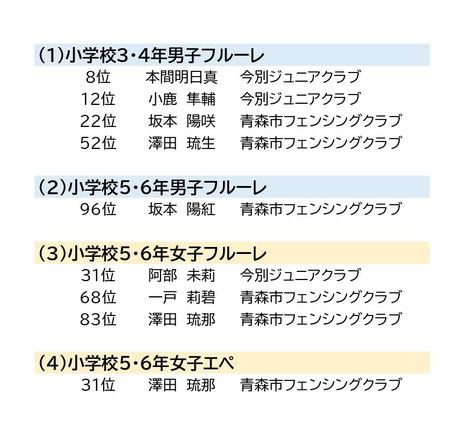 7月19~21日、駒沢オリンピック公園屋内球技場で開催。男子個人フルーレ 長谷川煌選手 106位/222人、女子個人フルーレ 横岡瑚子(今別ジュニア) 116位/155人、男子個人エペ 西澤怜皇選手(青森市FC)66位/129人、女子個人エペ 阿部陽莉選手(今別ジュニア)26位/88人