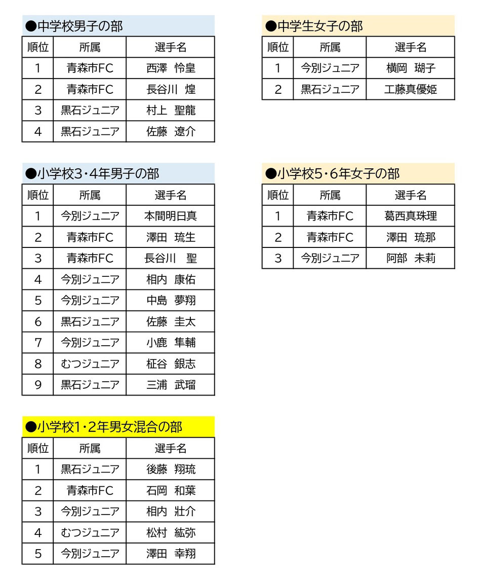 4月20日㈰、第1回県ジュニア選手権大会が、むつ市マエダアリーナで開催されました。小学校5・6年男子は、坂本陽紅選手(青森市FC)、3・4年男子は澤田琉生選手(青森市FC)、1・2年男子は後藤翔琉選手(黒石ジュニア)、小学5・6年女子は阿部未莉(今別ジュニア)選手が優勝しています